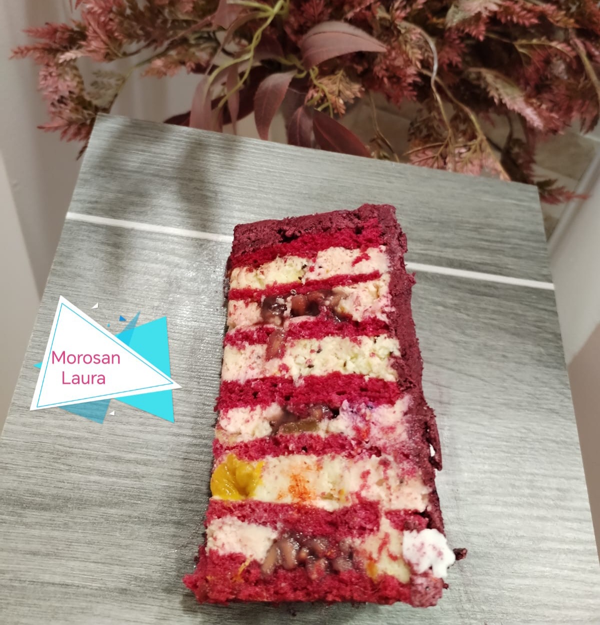 "Bună seara, am făcut blat de vanilie, cu bavareză de ciocolată, bavareză vanilie și inserție de fructe de pădure. A fost super super bun."