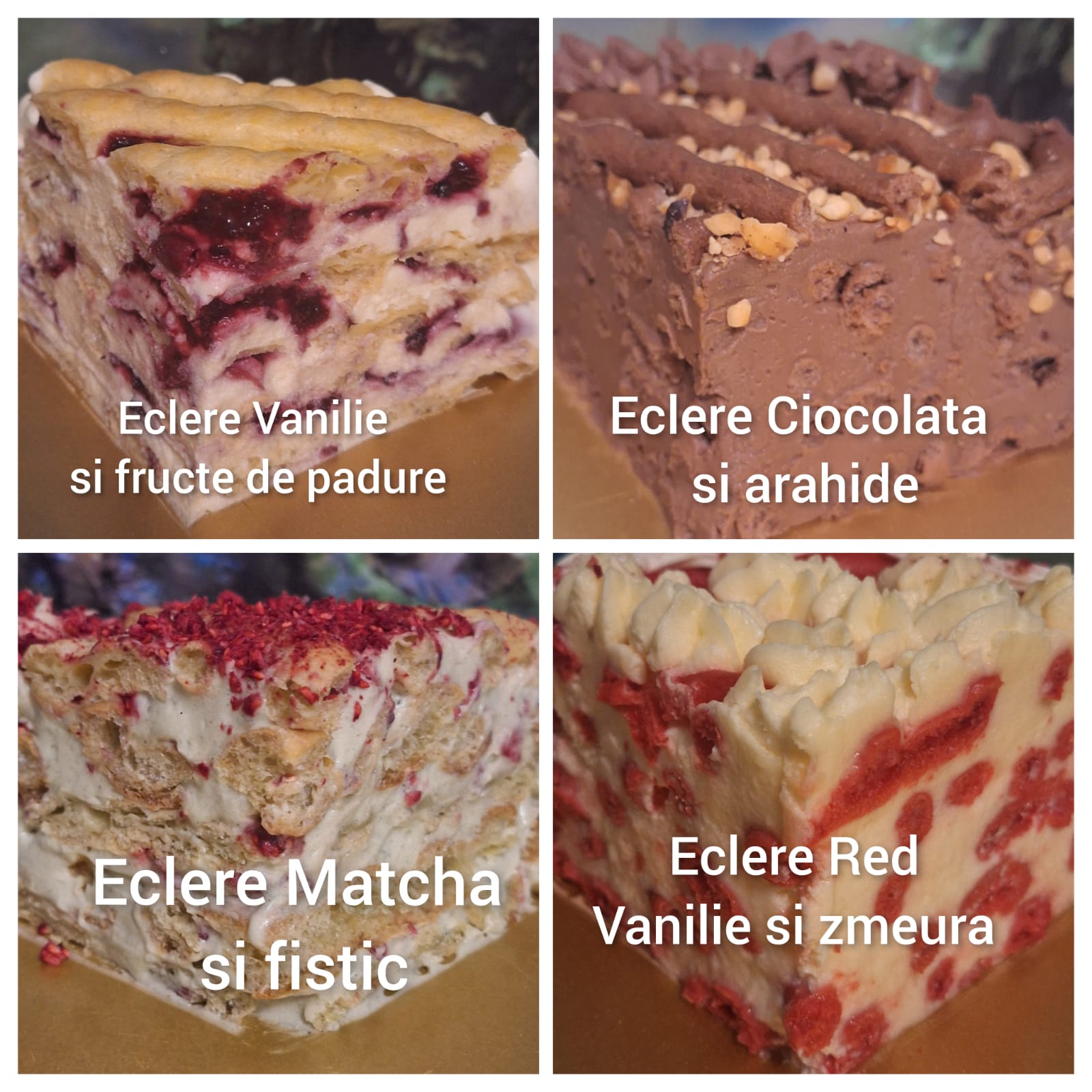 Tort Ecler-Grătar Red, Tort Ecler-Grătar cu fistic, Tort Ecler-Grătar cu ciocolată și Tort Ecler-Grătar clasic cu fructe de pădure.